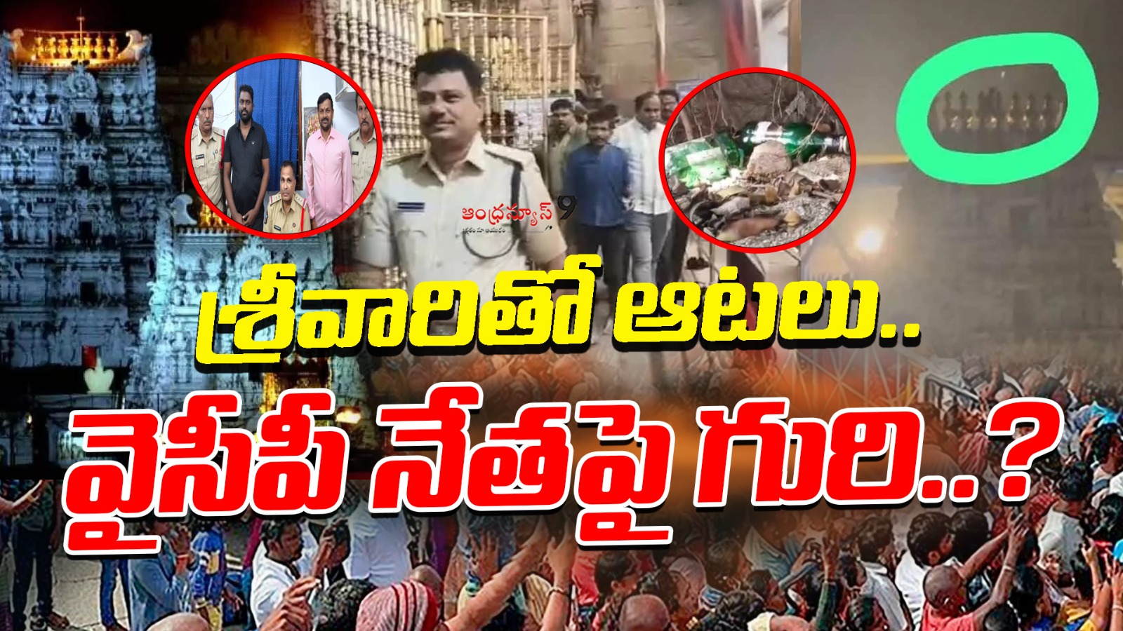 సాధారణంగా తిరుమలకు మద్యం అనుమతి ఉండదు. కానీ తిరుమలలో కాళీ మద్యం బాటిల్స్ ఉంచి సాక్షిలో ప్రసారాలు చేశారు. దీని వెనుక మాజీ ఎమ్మెల్యే భూమన అనుచరుడు, సాక్షి విలేఖరి సహా పలువురిని అదుపులోకి తీసుకుంది పోలీసు శాఖ. ఇక దీనిపై ప్రభుత్వ పెద్దలు ఆగ్రహం వ్యక్తం చేసినట్టు తెలుస్తోంది. ఇప్పటికే కల్తీ నెయ్యితో భక్తుల మనోభావాలు దెబ్బ తీసిన వైసీపీ.. తిరుమల శ్రీవారి ఆలయంపై వైసీపీ కుట్రలు చేయడాన్ని సీరియస్ గా తీసుకున్నారు.
